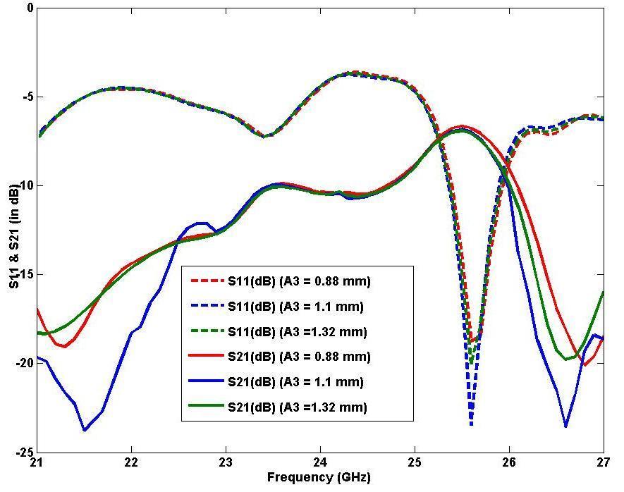 Fig.3. ParametricsimulatedS11(indB)&S21(indB)for parameterA3.