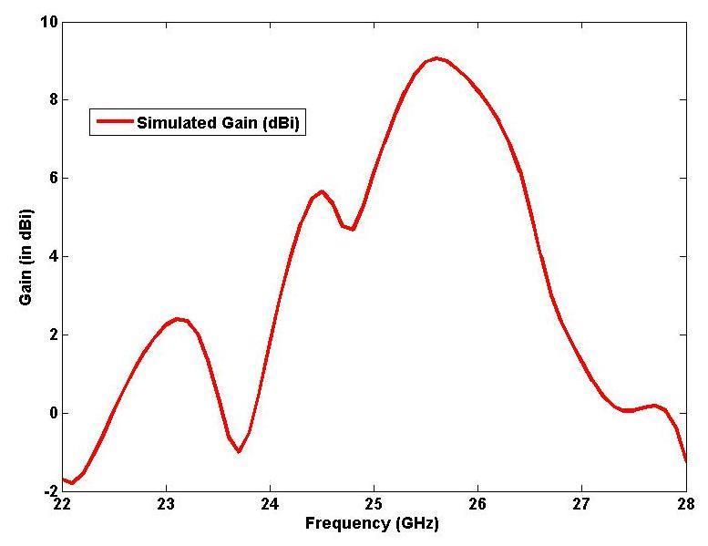 Figure 9 shows the simulated frequency (GHz) Uses us Gain(in dB) Plot. From the figure it shows that the peak gainof9.06dBi.