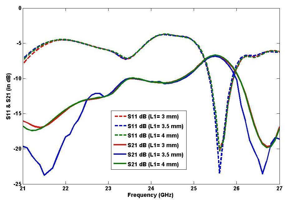 Fig-5: ParametricsimulatedS11(indB)&S21(indB)for parameterL1