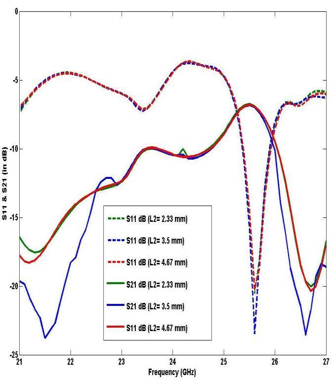 Fig-4: ParametricsimulatedS11(indB)&S21(indB)for parameterL2