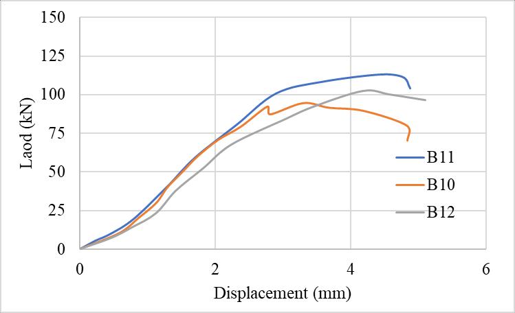 TheFigure3showstheload-displacementcurvesforthreedifferentbeams(B10,B11,andB12).Allthreebeamsshowsimilar initialstiffness,asindicatedbythesteepnessofthecurvesintheinitiallinearportionofthegraph.BeamB12exhibitsslightly lowerinitialstiffnesscomparedtoB10andB11,asitscurvestartstodeviatefromtheothersatlowerloads.Thefirstvisible deviationfromlinearity,whichcorrespondstotheformationofthefirstcrack,occursatdifferentloadlevelsforeachbeam. BeamB12reachesanoticeablecrackataround60-65kN,whileB10andB11showcrackingbehavioratslightlylowerloads. BeamB10hasthehighestultimateload,peakingcloseto113kNbeforefailure.BeamB11reachesaslightlylowerpeakload comparedtoB10,around95kN.BeamB12showsanultimateloadofabout102kN,whichislowerthanB10buthigherthan B11