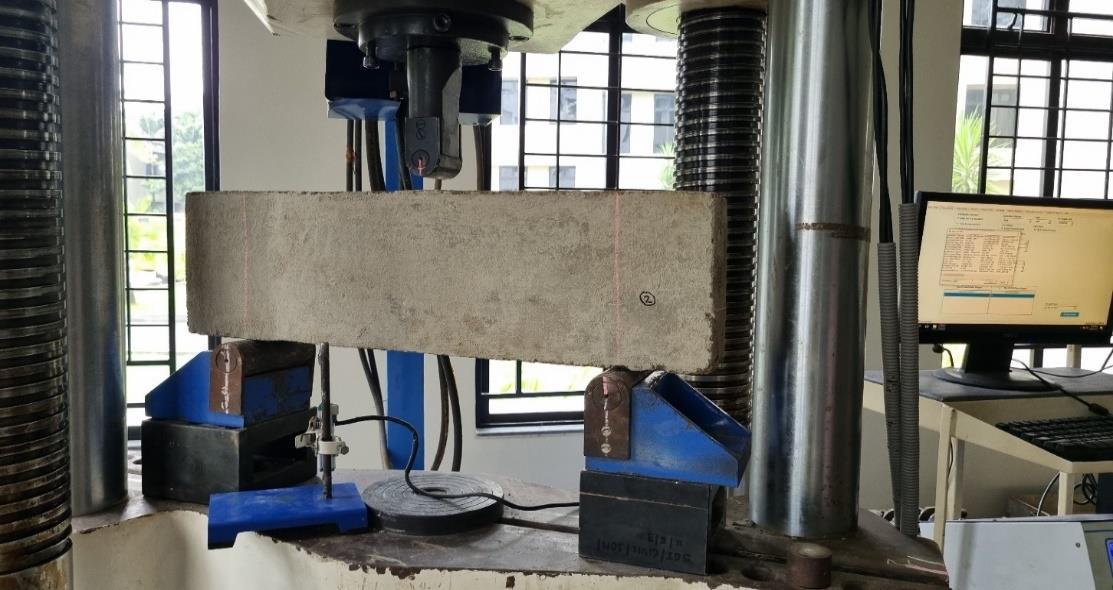 Testingareinforcedconcrete(RC)beamsectionunderthree-pointloadinginvolvesplacingthebeamonaUniversal TestingMachine(UTM)andapplyingaloadatasinglecentralpointwhilesupportingthebeamatbothends.Thistesthelps determinetheloadcarryingcapacityandbehaviorofthebeamunderload.Thetestingofareinforcedconcrete(RC)beamunder three-point loading is conducted using a Universal Testing Machine (UTM) with a capacity of 1200 kN. Here is a detailed procedureforconductingthistest: