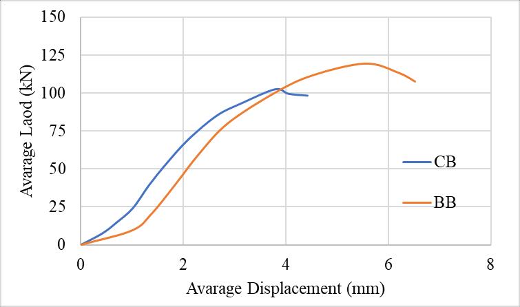 TheexperimentalanalysisoftheRCbeamsretrofittedwithBFRPfabriconthebottomsideonly(BB)showsanotable improvementintheirload-carryingcapacity.Theaverageloadatfailurefortheseretrofittedbeamswasfoundtobe120.90kN. This is a significant enhancement compared to the control beam, which had an average load at failure of 102.72 kN. The application of BFRP on the bottom face alone led to a 17.7% increase in load-carrying capacity. This result highlights the effectiveness of BFRP retrofitting in strengthening RC beams, even when applied only to the bottom side. The increase in capacitycanbeattributedtotheadditionaltensilereinforcementprovidedbytheBFRPfabric,whicheffectivelyresiststhe tensileforcesinducedbybending.