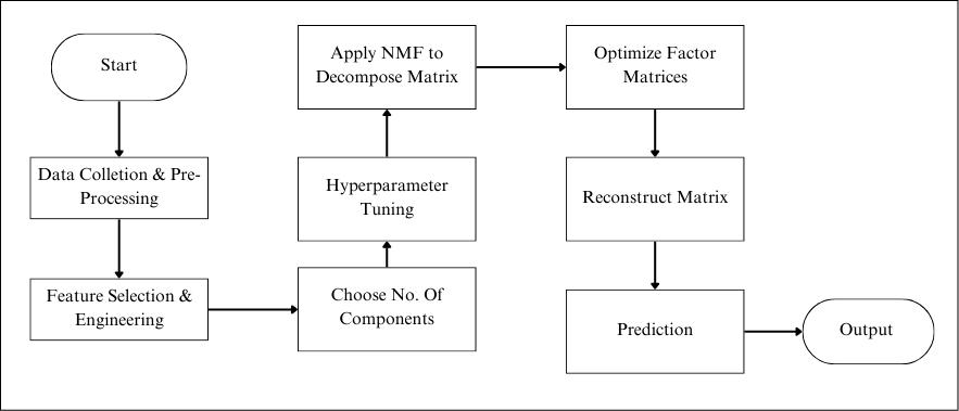 It is commonly used in fields such as: Recommendation systemsaredesignedtoproposeproductsorservicesthat usersmaybeinterestedin.Textmininginvolvesidentifying patternsandsubjectsintextdata.Imageanalysisinvolves extracting features from photographs. NMF is an effective approach for identifying meaningful patterns and hidden insightsinmassivedatasets.NMFemploysideasfromlinear algebra and multivariate analysis. The method repeatedly altersAandB’svaluesuntiltheirproductapproachesX.This approach assures that the base and weight values are not negativewhilepreservingtheoriginaldatastructure.NMF terminates when the approximation error converges or a presetnumberofiterationsarereached.Itmustbeseeded with a value to act as the starting point for subsequent cycles.Thisisbecausetheprocessingspaceisverylarge,and there is no global minimization technique. As a result, correct initialization is critical for achieving significant results.