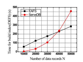 Fig. 2(a) shows the relationship between the size of the index (aka., EDB) and the number of data records. The recordputawayinCSisawordreferencewithakey-esteem pairthatisfiguredbythesolidhashcapabilities.Thelength of the word reference connects with the quantity of information records in the data set. As a result, as the number of data records increased, so did the size of the index.TherewouldbemoreciphertextsencryptedbyOPEas the dimensions increased. The size of the record expanded straightly as the quantity of aspects expanded. Fig. 2(b) depictstherelationshipbetweenthenumberofdatarecords and the amount of computation required for secure range search.TheEAFS'ssearchcomplexityisO(Q+F),whereQis the number of data that satisfy the query and F is the number of false positive data, as previously mentioned. Whenthenumberofattributesistakenintoaccount,weset thenumberof(Q+F)tobealmost2%ofthedataset'stotal number.Figs.3(a)and(b)showtheconnectionbetweenthe calculation cost of our plan and the absolute number of containers, |B|. Assuming the complete number of cans is little, and that implies that the scope of each pail is wide,