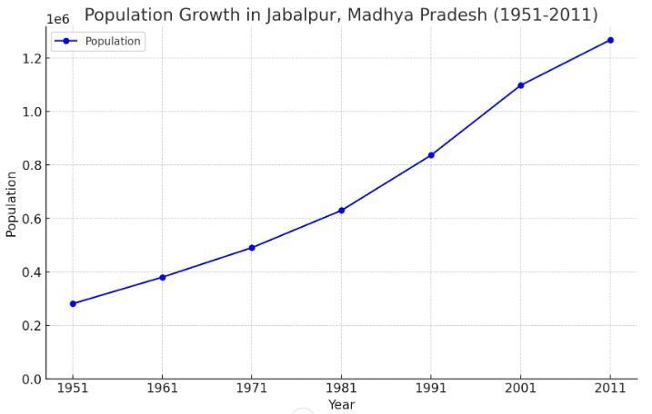 Urbanization in Jabalpur is characterized by substantial population growth. As per the 2011 Census of India, Jabalpur'spopulationsurpassed1.26million,representinga considerable rise from prior years. This growth can be attributedtobothnaturalincreaseandmigrationfromrural areasandsmallertowns,whereindividualsseekimproved employmentprospectsandlivingstandards.