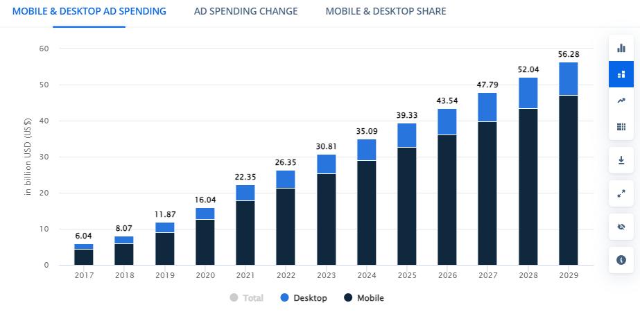 In graph, x-axis as years from 2015 to 2023 and Y-axis will show revenue of Facebook/Instagram (in billions dollars)