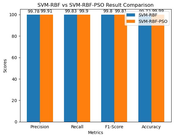 Figure 4.1 Bar chart presents a comparison of the SVMRBFandSVM-RBF-PSOperformancemetricsbasedonfour evaluation metrics: accuracy, recall, F1-score, and precision.Thex-axisshowseachmeasure,whilethey-axis