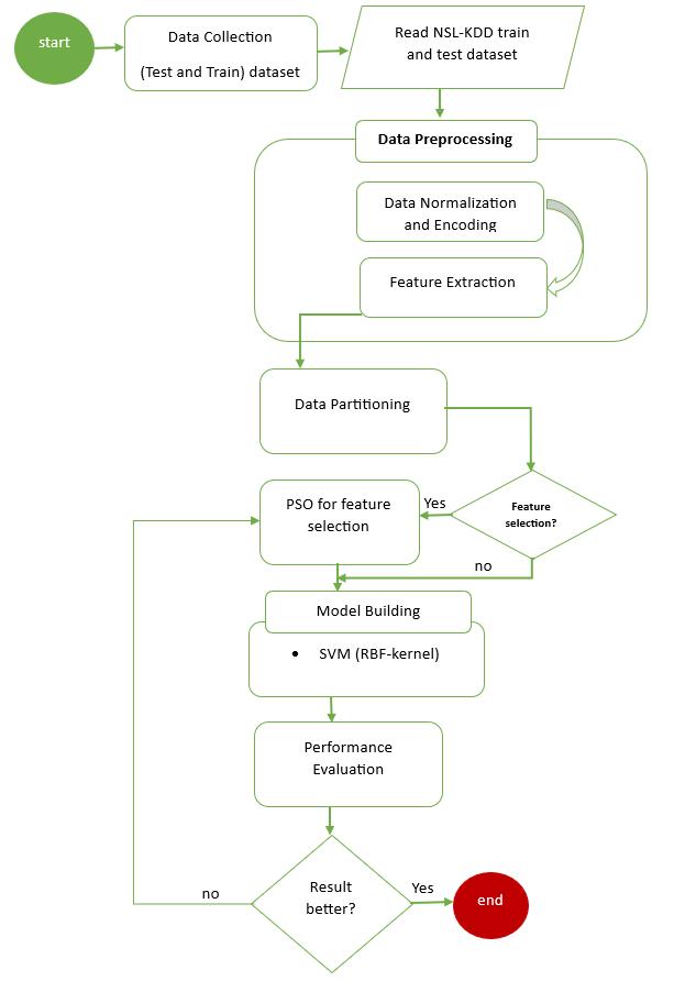 The proposed research methodology comprises three key phases: data preprocessing, feature selection, and classification with performance evaluation. Firstly, in the data preprocessing phase, the objective is to refine and clean the raw data to prepare it for analysis. This involves tasks such as handling missing values, normalizing data, andeliminatingnoiseoroutliersto ensurethedata isin a suitable format for subsequent analysis. Secondly, in the feature selection phase, the focus is on identifying and extractingessentialattributesfromthepreprocesseddata. The aim is to retain only those features that significantly contribute to detecting network intrusions, thereby reducing dimensionality, enhancing model performance, and improving result interpretability. To achieve this, a meta-heuristic approach utilizing the PSO algorithm for feature selection is proposed. Lastly, the classification and performance evaluation phase involves using the features selected by the PSO algorithm to train a machine learning classification model, specifically the SVM algorithm. SVM categorizesnetworkactivitiesasnormalorintrusivebased on learned patterns. Following training, the model's performance is assessed using metrics such as accuracy, precision, recall, and F1-score to ensure its reliability and effectiveness in identifying network intrusions. The proposed methodology approach can be visualized in Figure3.1.