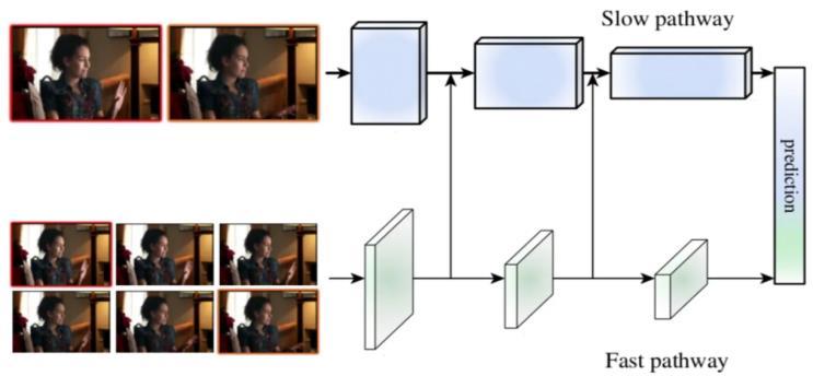 Architecture Overview: At the heart of the SlowFast model isadual-patharchitecture,featuringtwoseparatestreams for processing video frames at different temporal resolutions. The "Slow" pathway operates at a reduced frame rate, capturing the broader context and global temporal information. Conversely, the "Fast" pathway processes frames at a higher frame rate, focusing on finer details and rapid temporal changes. This dual-stream design allows the model to balance the trade-off between capturing long-term dependencies and reacting swiftly to temporal nuances, resulting in a more comprehensive understandingofvideocontent.