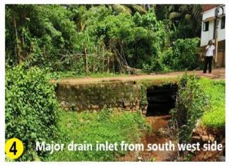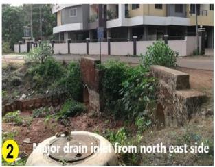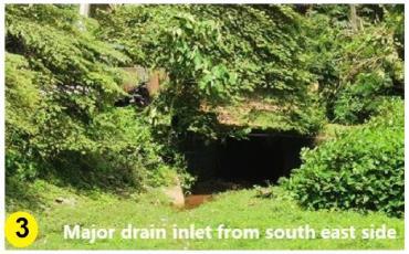There is a total of three inlets into the lake (points 2, 3 and 4 as shown in Fig 2.3), through which water flows in, while there is only one outlet (point 1 as shown in Fig. 2.3), through which the water flows out. Major drains are present on the north eastern side of the lake. A step well is situated on the western side of the site, jutting out into the lake. Fig. 2.4 shows the photographs of inlets and outlets with reference to Fig. 2.3. The inlet/outlet will be referenced in the order as in Fig. 2.3 for every further analysis in the report.