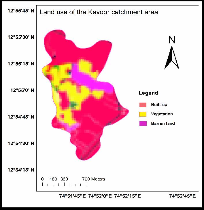 interaction among the local people. The predominant land use around the lake is residential, with a few pockets of commercial along the approach roads. A patch of public and semi-public space around the site has also been demarcated. It is to be noted that the immediate area surrounding the lake has been demarcated as green as it forms an integral part of the lake ecosystem. The land cover classification of the entire catchment area showed the principal land use in the catchment to be vegetation and the rest built-up and barren land. The areas of the same are given below: