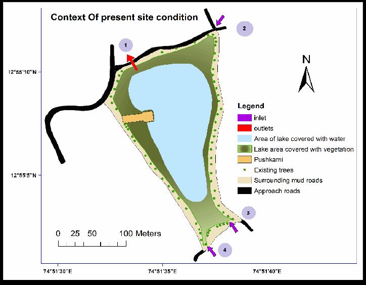 The lake is accessed through the Bajpe road along the north western edge. The site has a vehicular access with paved roads on the northern and southern edges, while the eastern and western edges are bound by kutcha roads. The width of all roads existing around the site ranges from 4 meters to 6 meters.