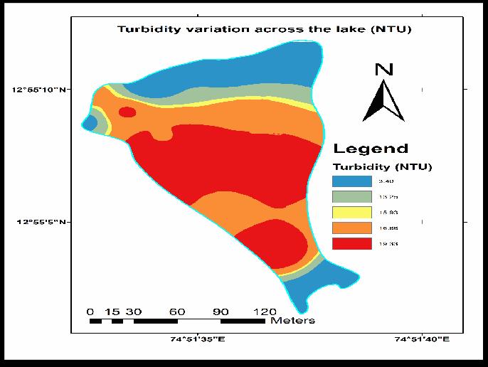 The turbidity varies from 3.5 NTU at the inlets to 17 NTU at the centre of the lake and is 29.2 NTU in the temple tank. The turbidity of water at the outlet is 7.62