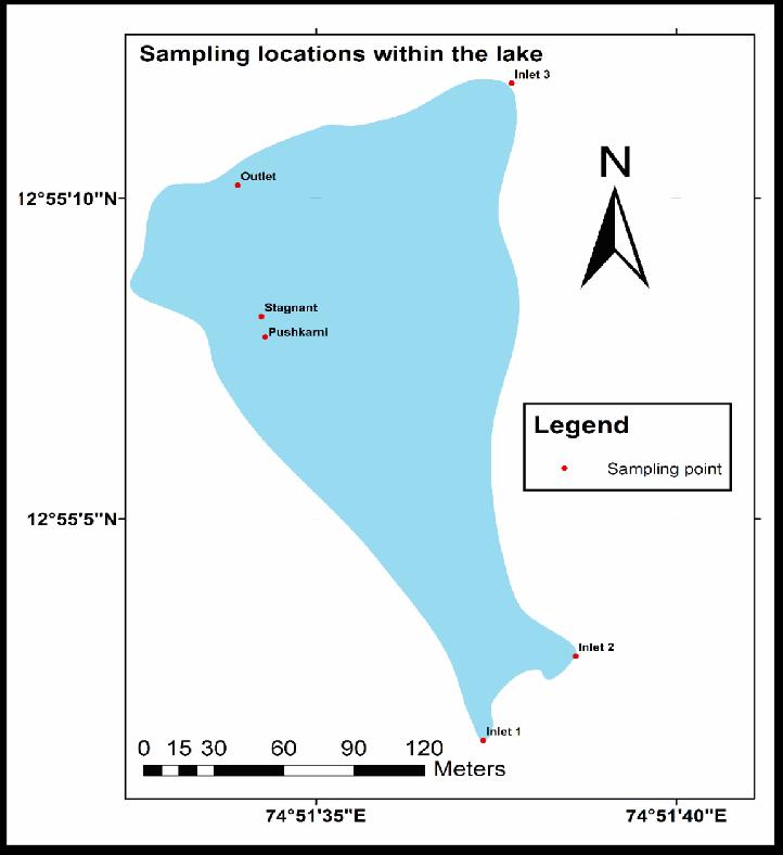 Sampling for hydro-biological parameters was done from six different locations of the lake on 25th October 2019 and the samples were preserved in air tight containers. The sampling locations are shown in Fig. 3.5