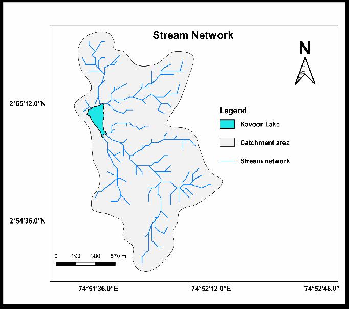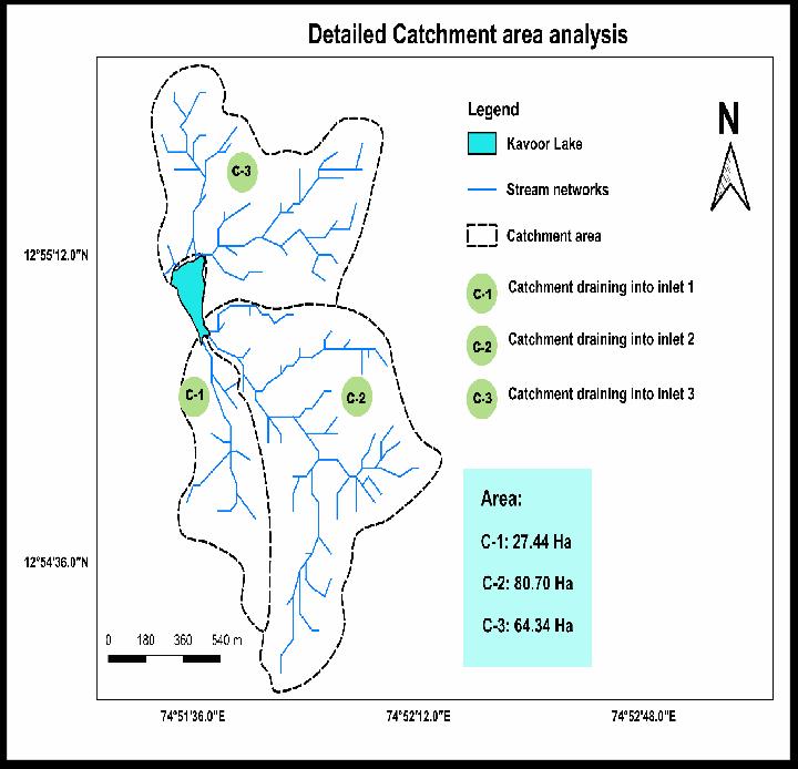The total catchment area of Kavoor lake is around 171 Ha. CARTOSAT DEM was further used to obtain the stream order and the stream network. Fig. 3.3 shows the stream network leading to the lake. Three distinct stream networks within the catchment area draining into each of the 3 inlets were identified.