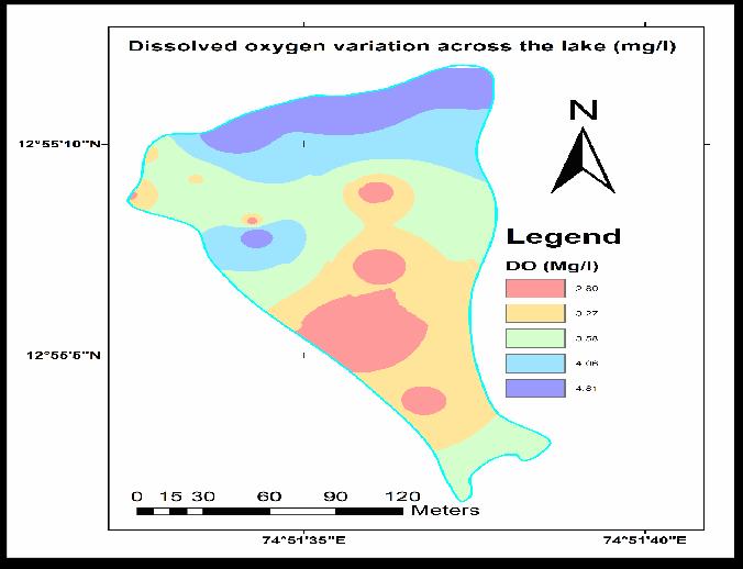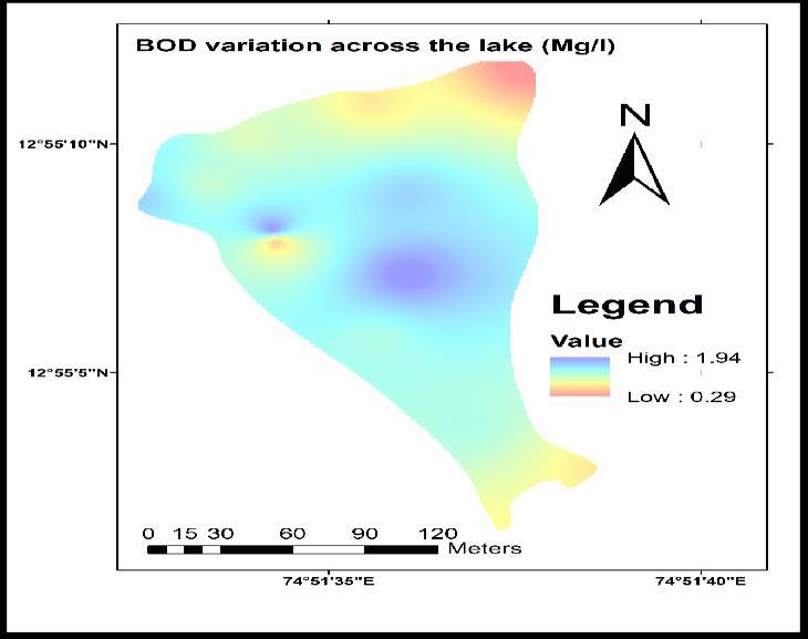 The BOD5 of the effluent is close to the permissible limit and can be used for drinking. The maximum BOD value recorded is in the stagnant waters at the centre of the lake. This value, 1.87 indicates only a slight contamination of the lake water.