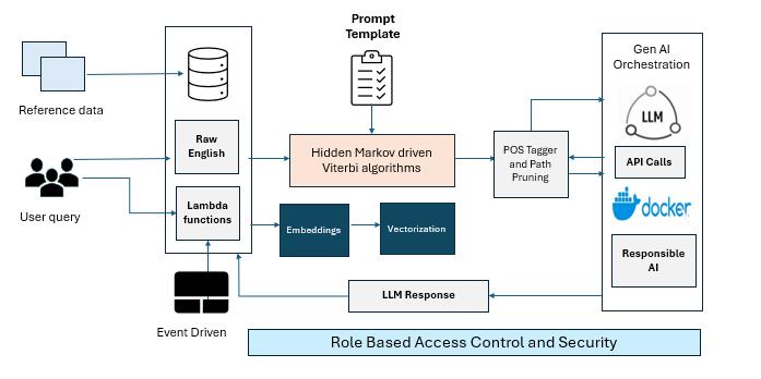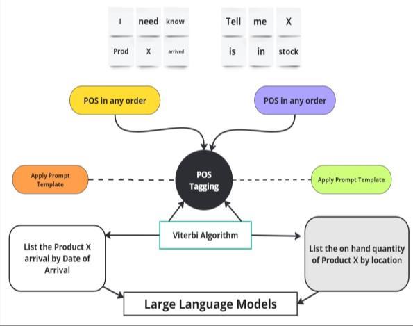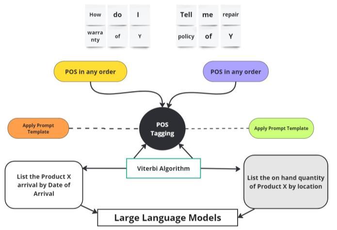 Viterbi layer: Raw English is considered Hidden Markovstatetransitionsystem,considerationofthe transition and emission probabilities in Markov process followed by possible types of POS tagged statements using the POS tagger. The prompt templatewillhelptorealignthePOStaggedoutput into the expected prompt required for LLM interaction.Thewholesolutionwillbeeventdriven andhenceisautomated