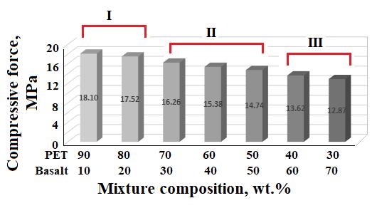 Fig. 2.CompressivestrengthofsamplesdependingonthecompositionoftheinitialPET-basaltmixtures.(I)bricksforhigh load-bearingloads;(II)bricksforbuildingsof2-3floors;(III)bricksforbuildingsof1floor.