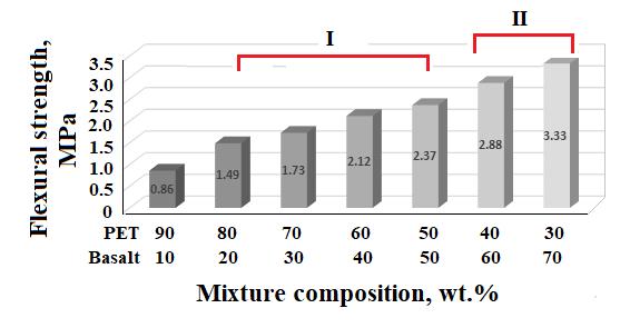 3.FlexuralstrengthofsamplesdependingonthecompositionoftheinitialPET-basaltmixtures.(I)bricksforbuildingsof 1-2floors;(II)bricksforbuildingsof1floor