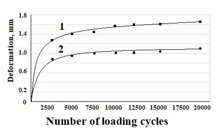 Fig. 4.Thevalueofruttingdeformationofsamples/pavingstonesobtainedfrommixturesof40wt.%PET-60wt.%basalt(1), and30wt.%PET-70wt.%basalt(2).