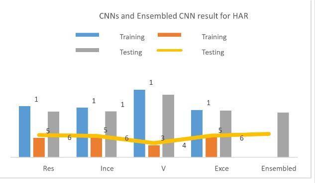 measure of its generalizability and performance in realworld scenarios. While ensemble models offer enhanced accuracy and robustness, they necessitate greater computational resources and present complexities in management.Ensuringdiversityamongthemodelswithin the ensemble is vital for achieving superior performance. Moreover, the selection of base models, ensemble techniques,andpreprocessingstrategiescriticallyinfluences the overall effectiveness of the HAR system. This methodologyamalgamatesthestrengthsofvariousCNNsto advance the precision and resilience of HAR systems, rendering it apt for deployment across a spectrum of practical applications, from surveillance to healthcare monitoring.