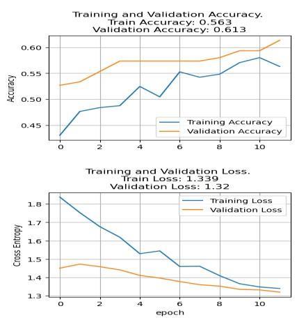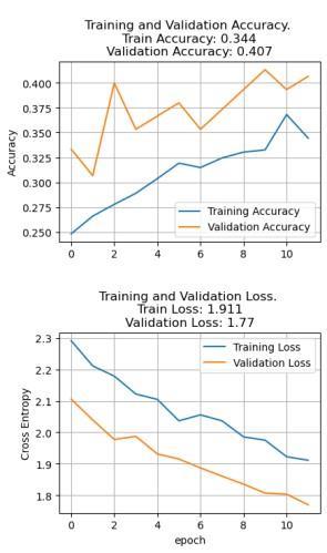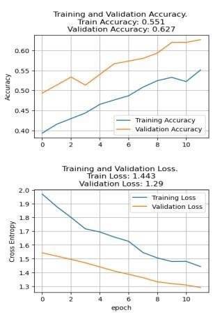 ResNet50 shows a training loss of 1.443 and a training accuracyof55.1%,whichimprovestoatestinglossof1.29 and a testing accuracy of 62.7%. This indicates that ResNet50, with its residual connections to combat the vanishing gradient problem, performs reasonably well, showingimprovementfromtrainingtotesting