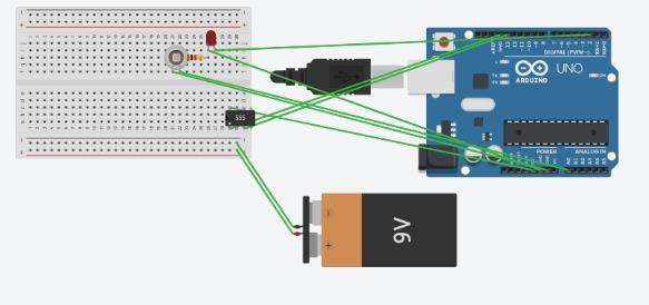 Figure 2.1:Simulationoftheproposedsetupon Tinkercad(9VBattery,ArduinoUno,Photodiode,555IC Timer,LED,220OhmResistor,JumperWires)