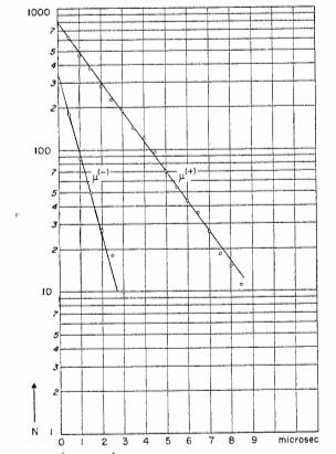 Figure 1.3 : Disintegration curves for positive and negative muons in aluminum. The ordinates at t = 0 can be used to determine the relative numbers of negative and positive muons that have undergone spontaneous decay. The slopes can be used to determine the decay time of each charge species. (From Rossi, p168.)