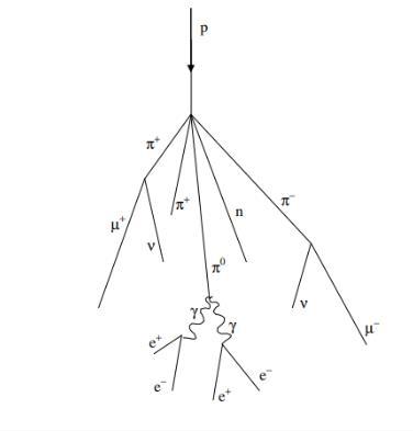 Figure 1.2:Cosmicraycascadeinducedbyacosmicray protonstrikinganairmoleculenucleuspresentinthe atmosphere.