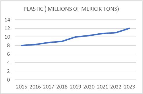 Thechartshowsaconsistentriseinplasticwastegeneration from2015to2023,increasingfromabout9milliontonsto approximately12milliontons.Anotablespikebetween2021 and2023indicatesacceleratedwasteproduction,potentially linkedtopost-pandemicindustrialactivities.Thenear-linear trendhighlightsthegrowingchallengeofmanagingplastic pollution. Urgent measures such as improved recycling techniquesandregulatoryinterventionsareneededtocurb thisenvironmentalissue.