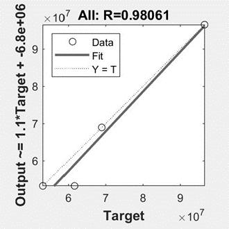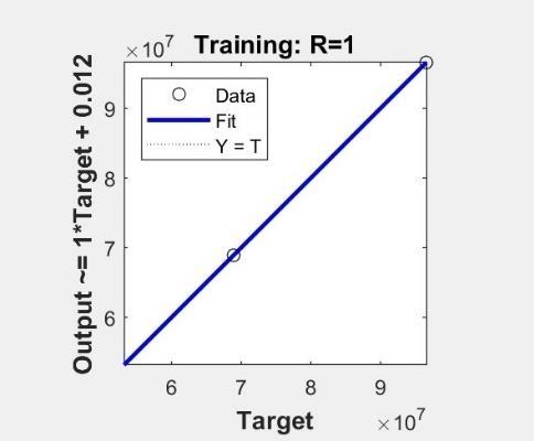 Theseresultswereobtainedaftersevenattemptstotrainthe neural network. Because our study only included four exampleprojects,onlyonecouldbevalidatedandanother examined.Asaresult,Rhasnovalueintheirrespectiveplots, asseeninFigures3and5.R=NaN(Notanumber).Iftheplot containedalloftheprojects,aregressionrelationshipmight be established. There is a very strong linear regression betweentheprojectsinthequantitativeassessment,withan R-value of 0.98061. This substantial correlation in quantitativeassessmentcanbeattributedtothetuningofthe weights in biases in neural network training, which was accomplished using random weight initialization and supervisedtraining.