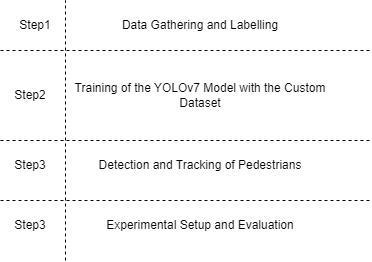 Thethreeprimarystagesofourmethodologyareasfollows: DataCollectionandLabeling,YOLOv7ModelTrainingusing theCustomDataset,andPedestrianDetectionandTracking. Every stage is carefully crafted to tackle the difficulties associatedwithdetectingpedestriansinlowlightareas.The flowoftheresearchisshowinthefig2.