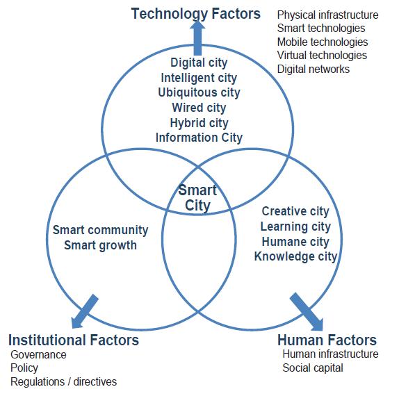 This section discusses a set of factors which make a city smart according to the literature. From the discussion of conceptualvariantsofsmartcityintheprecedingsection,we identify and clarify key components of smart city, and recategorizeandsimplify themintothreecategoriesofcore factors: technology (infrastructures of hardware and software),people(creativity,diversity,andeducation),and institution(governanceandpolicy)