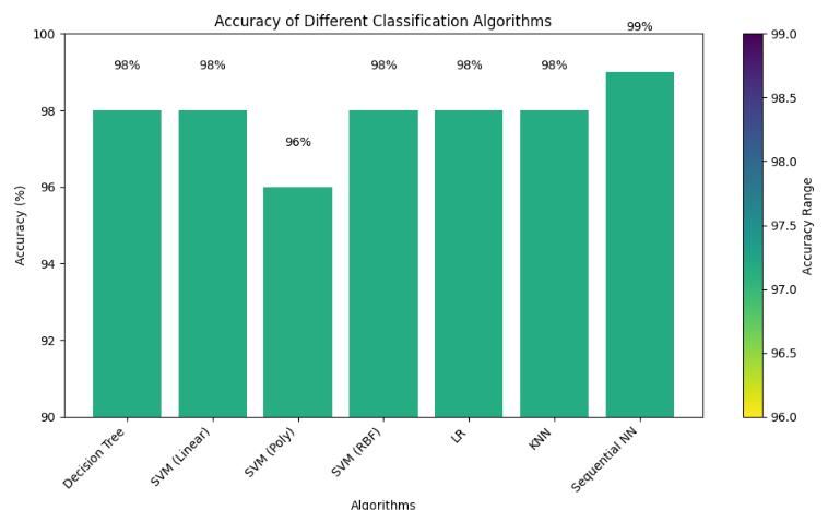 Insummary,thestudy,classweightsandstratifiedsampling areusedduringmodeloptimizationtoaddressissueswith class imbalance that are frequently present in malware detection. The effectiveness of the model is thoroughly assessed,accountingforbothtestingandtrainingaccuracy. Notably, the model outperforms earlier techniques like LogisticRegression,randomforestclassifier,KNN,XGBoost by achieving an impressive accuracy rate of 99% on the Drebin dataset and other dataset. The performance of the model is fully analyzed using a set of evaluation metrics, includingaccuracy,recall,precision,F1score,andconfusion matrix.
