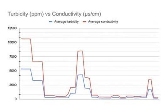 μs/cm while there was a turbidity of 10617 ppm. Contrastingly, in sample 31 there was a conductivity of 357 μs/cm with a proportionately low turbidity of 712 ppm. Regardless of the sample number, there is a direct proportion between the two parameters. This can be quantitativelybackedbydividingthetwovaluesresulting in a constant. For any sample, the average conductivity divided by the average turbidity results in the numerical constant ~2. This was one such prediction that the hypothesispredictedcorrectly.