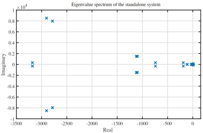 In Fig. 7, the designed three VSIs (10kVA each) are connectedtoadistributednetworkinstandalonemodefor testing the stability and reliability performance. The eigenvalue spectrum of the consider network in Fig. 14 demonstrates the effectiveness of the designed controller system.Thenegativeeigenvalues indicatethatthesystem remainsstable duringstandaloneoperation. Thedifferent clusterpositionsshowthedifferentmodesinthemicrogrid system,suchasdistributionline,filter,power,voltage,and currentcontrollerstatevariables.Fig.15demonstratesthe effectivenessofthecontrollertrackingperformancewhen thereisasudden20%increaseinload-1atDG-1.Thesmall loadvariationataparticularDGinthenetwork,whilehere theloadincreaseoccursat0.5seconds,leadingtochangesin