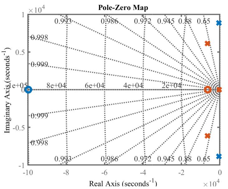 Fig - 8: Stabilityanalysis(a). Poleandzerosoftheclosed loopsystemwith(red)andwithout(blue)damping, (b). Bodeplotoftheplanttransferfunctionwith(red)and without(blue)damping