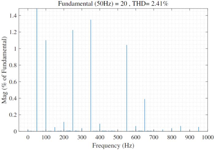 PIcontrolleroperatesonafixedfrequencyofthesystem,so itsoutputcouldbeunstableunderweakgridconditions.But the PR controller has cut-off frequency bandwidth (ωc) around the system frequency, as discussed earlier in the current controller structure. For this experiment, the frequencyvariationisconsidered±2Hz.Theparametersare determined similarly to the PI controller to obtain the requiredclosed-loopresponsefromthePRcontroller.The cut-offfrequencybandwidthcanbeextendedbytuningthe ωc.Thehighervalueofωc isresponsiblefortheincreasein peakmagnitudeatthesystemfrequency,whichcorresponds toahighergainvalueandbettercurrentrippleattenuation. Thelowervalueofωccorrespondstowiderbandwidthatthe systemfrequency[47].ThecomparisonforTHDanalysisby usingPIandPRcontrolleris showninFig.13.Theoutput currentTHDlevelsare below 3%asperrequirementsfor theweakgridapplications,whichshowsthequalityofthe outputcurrent.
