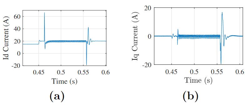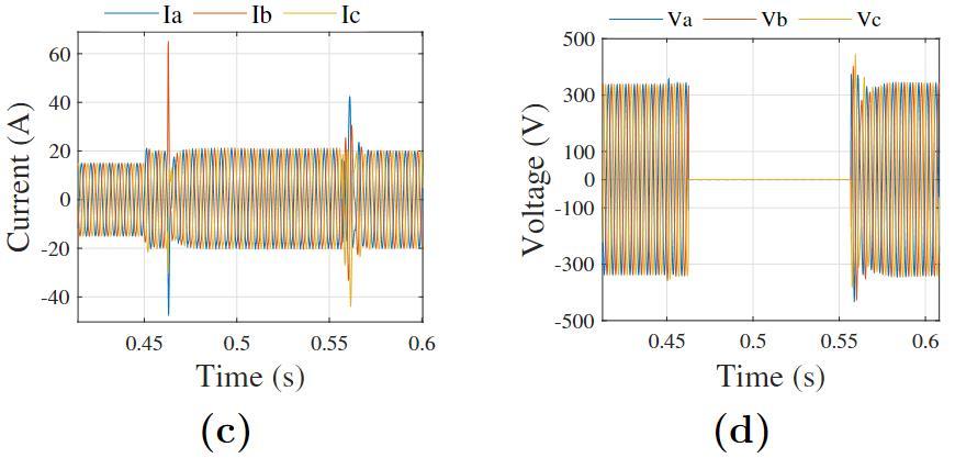 Fig -12: (a).Id current,(b).Iq current,(c).VSIoutput3ϕcurrentduringthefaultcondition,(d).Output3ϕ-voltage duringthefaultcondition.