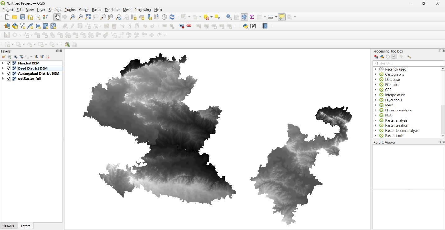 Inthisstudy,researcherscombinedremotesensingdata,GISsoftware,andmorphometricanalysistechniques.Theyutilized DigitalElevationModels(DEMs)obtainedfromthereliableOpenTopographywebsite.Thesehigh-resolutionmodelsprovided detailedterraininformationessentialformorphometricanalysis.Additionally,talukaleveladministrativeboundarydatafrom theSurveyofIndiahelpeddefinethestudyareawithinJalna,Aurangabad,Nanded,andBeedDistricts.UsingQGIS,theDEMs were clipped to obtain specific taluka and district extents. River networks were derived, revealing drainage patterns. Morphometricproperties(e.g.,ElongationRatio,BifurcationRatio)werecalculated,aidinginunderstandinghydrological behavioranddroughtvulnerability.Thestudycontributestoeffectivewaterresourcemanagement.