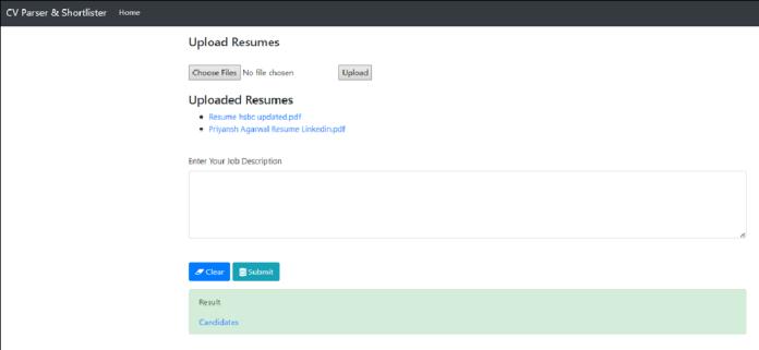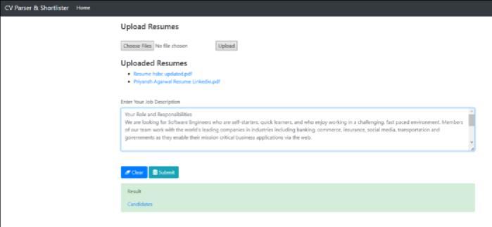 Figure 2 illustrates the overall interface of the Automated Resume Shortlisting Web App. This visual representation showcasestheuserinterfaceandtheprimarycomponentsof the application. It likely provides an overview of the softwarelayout,includingthedifferentsectionsandfeatures available to the users. This figure serves as a baseline referenceforreaderstounderstandtheinterfacedesignof theautomatedresumeshortlistingsystem.