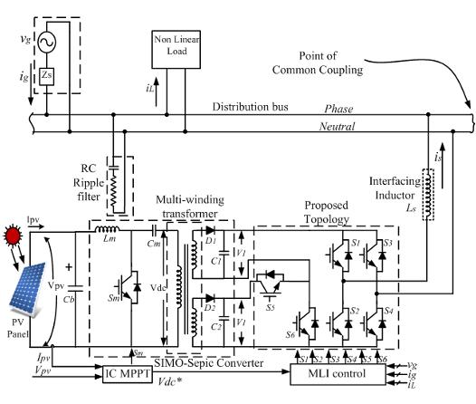 Generally,thesystemthatareconnectedtothegridareof twostages,thefirststageisDC-to-DCconvertersthatboosts thePVvoltagesandextracttheMaximumPowerbyutilizing MPPT and the stage two is to invert this DC power to AC power. The Maximum Power Point Tracking (MPPT) algorithm is used to track the maximum power the solar array. The second order generalized integral (SOGI) techniqueisusedtocontrol themultilevel inverter.Inthe proposedsystemitreducescomplexity,lessweight,lowcost, high efficiency, and sinusoidal current is injected into the grid[7].