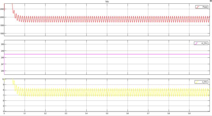 Figure 4, shows PV arrays power, voltage and current waveforms.ThePowergeneratedisaround2100Wandthe voltageandcurrentisaround248.5and8.3Arespectively.