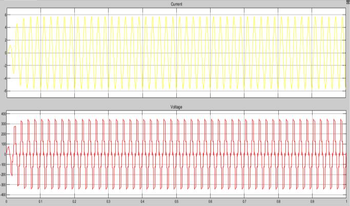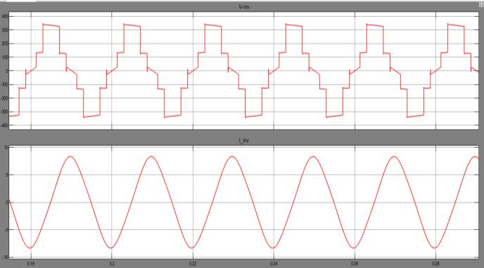 Figure 5, shows the output-voltage and output-current waveformsoftheH-BridgeMultilevelInverter.Theoutput voltageisaround300Vandcurrentisaround7A