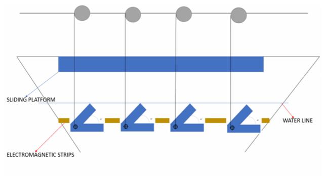 Figure 4. This shows the mechanism of the sliding platform that would be used to keep and dispose ECDS containers in the sea as per our design. White boxes depict ECDS containers and blue structures is the sliding platform