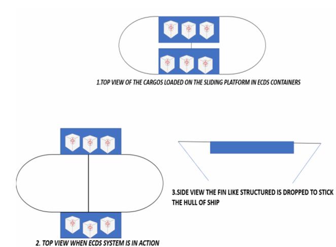 This system also suggests the incorporation of the thick electromagnetic strips running across the hull below the water line. The strip will activate when the ECDS containers are dropped off through strings or any rope in the sea water, precisely it will activate as soon as the ECDS system starts acting. When situation suggest a condition of extreme emergency and urgency to decelerate the ship, the boxes with the platform would slide outwards the hull depicting fin like structures and the platforms would fall and stick to the hull and the boxes will be dropped. As soon as the boxes are made to drop into the water, the electromagnets running across the hull will be activated and the boxes would be made to stick to the electromagnetic strips. The boxes would enhance the amount of the area exposed to the water exponentially adding up the drag force, ultimately increasing the resistive force.