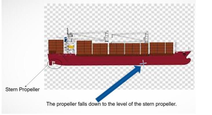 The second part of our solution suggest installation of addons propeller (Figure 5) to the already existing propellers but these propellers will be placed in the front region of ships. These will completely fit into ship’s side walls maintaining the streamline shape of ships and will only come out when EBP mechanism is initiated. They will then drop into sea to the level of stern propeller (figure 6) and will start to operate in a directionsoasto opposethemotionofships.Thiswill increasetheresistanceofferedtotheshipsmotion.The sterns propeller rpm will be then reduced and directionreversedsothatitreachesnothrustposition. The speed of stern propeller will be then increased in opposite direction so that it matches the speed of EBP