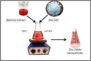 To synthesize ZnO nano-particles, 500 ml of beetroot extract was transferred in a 500 cm3 beaker having a magnetic bead. The solution was heated to 60 °C followed by the mixture of 45 g of zinc acetate. The pH of the solutionwasmaintainedbetween8.0.