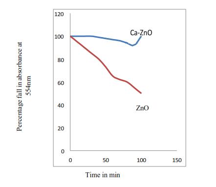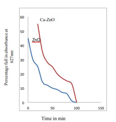 Figure 8 shows that there is 80% degradation in 100 min with blank ZnO nanoparticles at wavelength of 627nm & 100% degradation after 60min with calcium coating at 627 nm. This shows that calcium coating increases the percentageofdegradationincaseofMethyleneBlue.